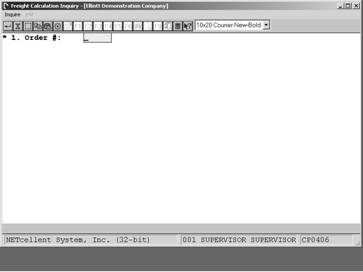 Field 1. Order #: Enter order number or if you are doing a freight calculation inquiry for a non-existing order, press <enter> in Field 1 and a Customer # field will appear with F7 and F8 key options to search by customer Number or Name.