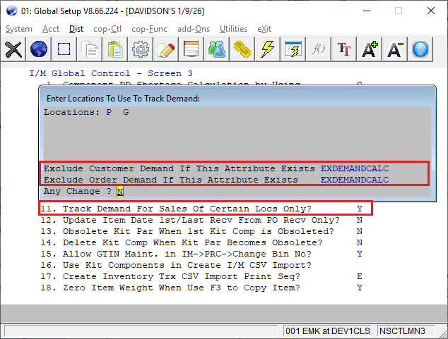 To support this feature, a new option has been added to the popup window if answering "Y" to Global Setup Flag in Dist -> I/M Global Control -> Screen 3 -> 11. Track Demand For Sales of Certain Locs Only.