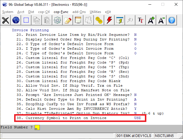 The new field, 38. Currency Symbol to Print on Invoice, is available in System Utilities-> Global Setup-> COP-Func-> Invoice Printing.