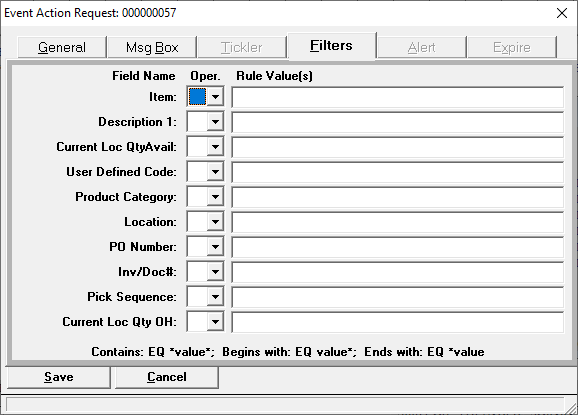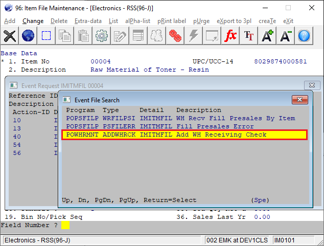 The ADDWHRCK event is derived from the ADDPORE2 event. The previously supported ADDPORE2 event works the same way. The difference in the ADDPORE2 event is the time that it is triggered. This event is triggered when a receiving transaction is added in Warehouse Receiving once the user reaches the field 4. Our Doc Number. The idea is that if the item is out of stock, the warehouse can be notified by either email or message box to remind them to prioritize processing this particular receiving.