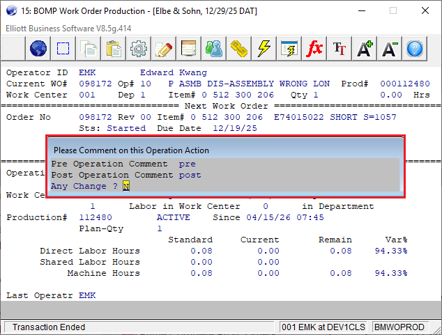 If both flags are set to Y for either the product routing operation or the special operation and 11. Allow Editing Pre-Comment When Enter Post-Comment is set to Y, the user will be have the ability to override the pre comment when ending a production operation or a special operation.