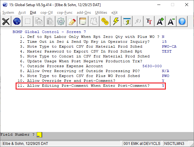 This feature allows the user to change the pre comment entered for an operation when entering the post comment. This is enabled via System Utilities-> Global Setup-> Dist-> BOMP Global Control-> Screen 7-> Field 11. Allow Editing Pre-Comment When Enter Post-Comment.