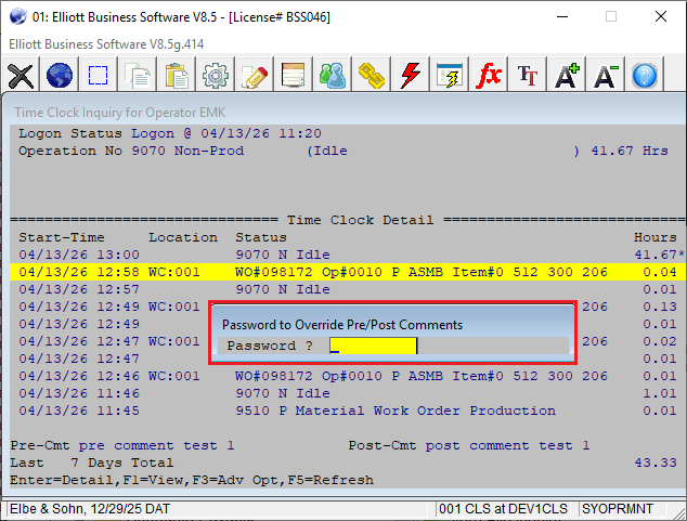 The same procedure applies for special operations. If a user other than the original operator on the operation attempts to change the pre/post comment on an operation, they will be prompted for an override password. The pre and post comments can be edited from the popup window.