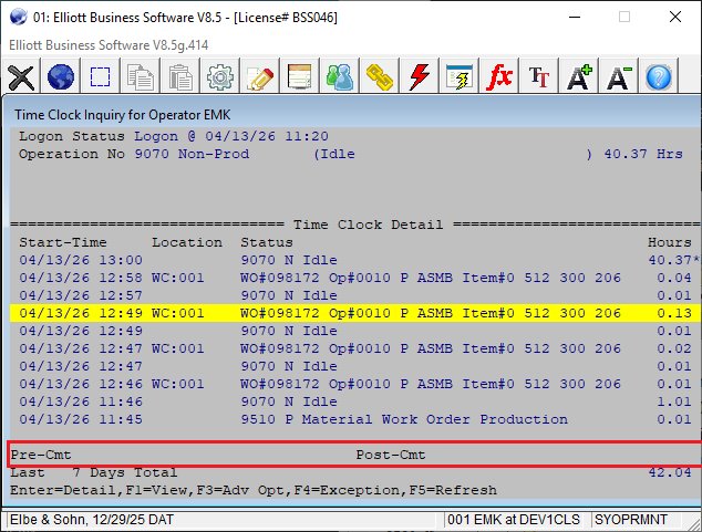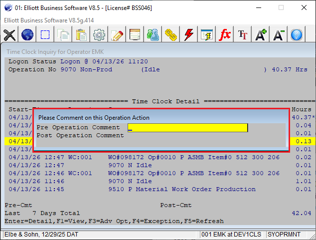 To change the pre or post comment for a timeclock detail entry for a plus production work order, press the F3 key for the Adv Opt option. Choose the Change Pre/Post Comment option.