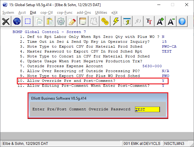 If set to Y, you will be prompted to Enter Pre/Post Comment Override Password. This is a required field. If a user other than the original operator on the operation attempts to change the pre/post comment on an operation, they will be prompted for this override password.