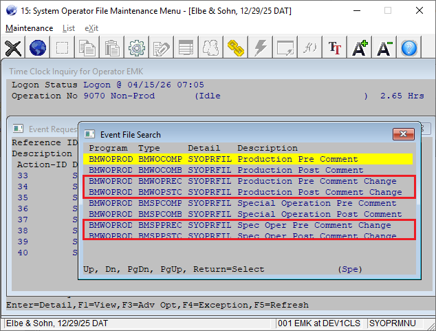 Event Program: BMWOPROD (registered through Operator File Maintenance)