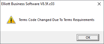 Whenever billing selection takes place and the terms code on the order supports an auto change terms code, the order total sales amount will be evaluated to determine if it is greater than or equal to the threshold specified in the terms code. If true, the terms code on the order will be changed to the auto change terms code specified in field 14 in terms code maintenance. If this change occurs during order entry or order billing, the user will be presented with the message "Terms Code Changed Due To Terms Requirements."