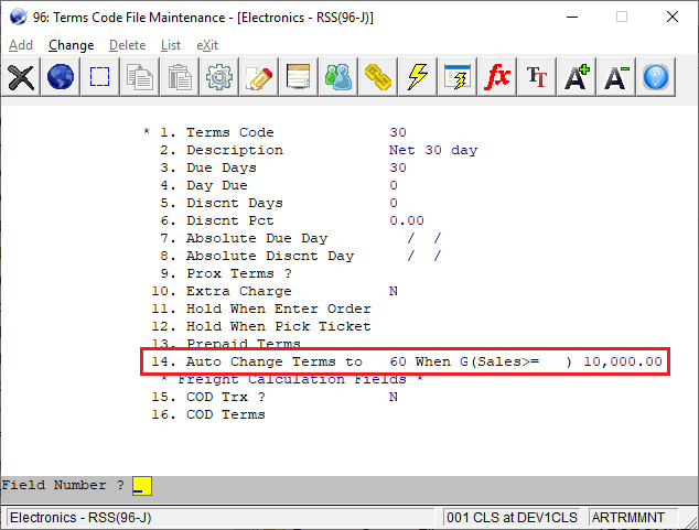 14. Auto Change Terms to - Enter spaces to disable. Enter a valid terms code to enable. F7 search is available. The terms code entered must be on file and cannot be the same as the terms code in field 1.