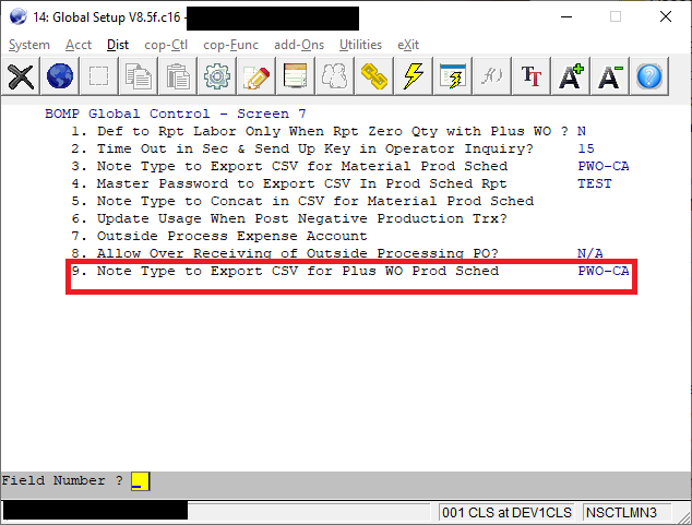 This feature allows the user to choose a specific note type that will be exported to CSV when the user runs the BOMP Production Schedule Report for plus production work orders. A new option has been added to System Utilities-> Global Setup-> Dist-> BOMP Global Setup-> screen 7-> Field 9. Note Type to Export CSV for Plus WO Prod Sched.