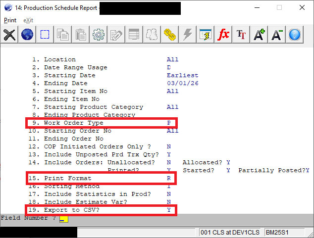 9. Note Type to Export CSV for Plus WO Prod Sched - The default is spaces. F7 search is available. If a value is entered, the note type must be on file. This option allows the user to choose a specific note type to be exported to CSV for each operation when the report is run for plus work orders (field 9 below) and when choosing to print routing detail (field 15 below option "R"). The same note type will be exported to CSV if attached to the production order file and the brief detail option is chosen (field 15 below option "B").