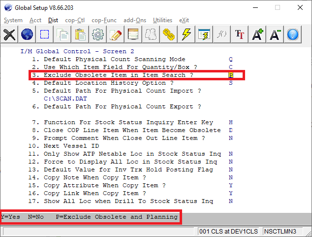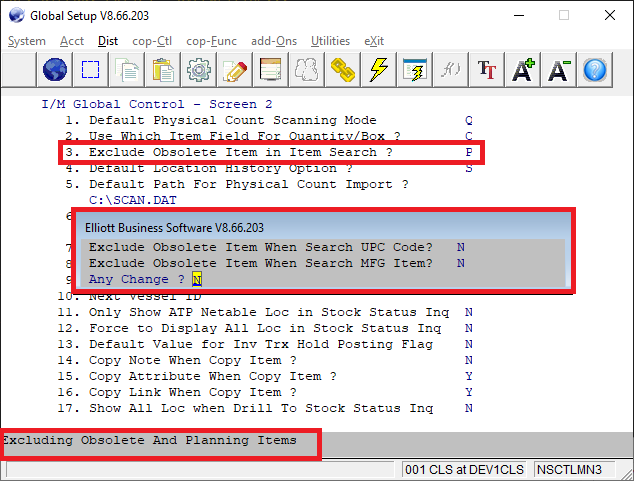 This feature gives the user the ability to find an obsolete item when entering a UPC code or manufacturer's model number. A new option "P=Obsolete and Planning" to Dist, I/M Global Setup screen 2, and field 3, Exclude Obsolete Item In Item Search.