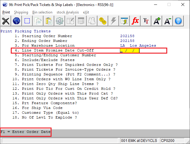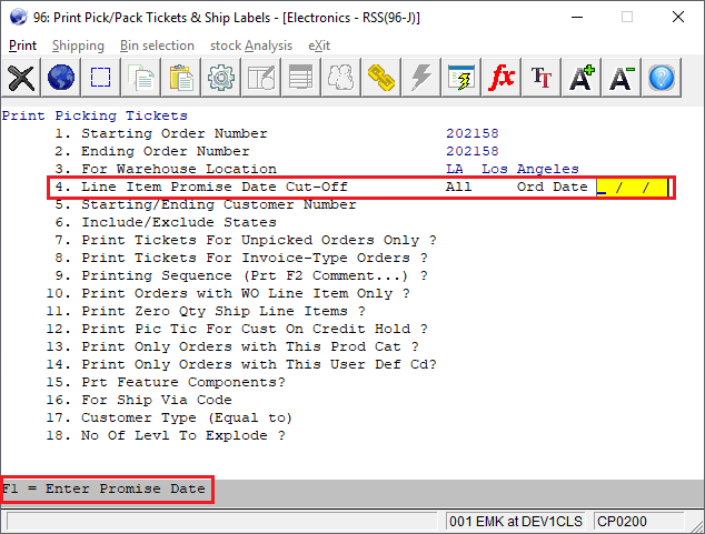 This feature allows the user to specify a single order date as the cut off when printing picking tickets. This allows the user to prioritize orders based on this date versus the line item request/promise date. A new F1 toggle is now available from field 4. Line Item Promise Date Cut-Off.