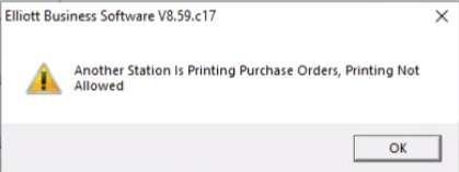 The new Print One PO option was added to help alleviate locking issues when multiple users are attempt to print purchase orders at the same time. For example, if a user is printing a range of purchase orders and another user attempts to print a purchase order immediately from Purchase Order processing, they would receive the message "Another Station Is Printing Purchase Orders, Print Not Allowed".