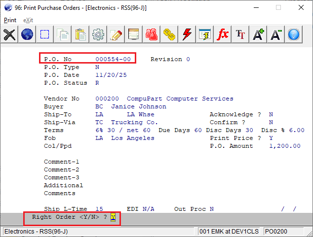 P.O. No - The field is required. Enter the purchase order number to print. F7 search is available.