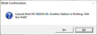 After entering a valid purchase order number, the purchase order information is displayed and the user confirms that the correct purchase order has been chosen. Once a PO is chosen, the application will check if another user is printing purchase orders. If true, the user will be presented with the message "Cannot Print PO 123456-00. Another Station Is Printing. Will You Wait?".