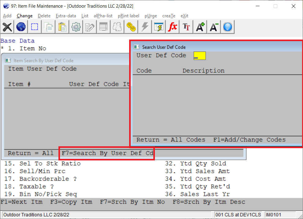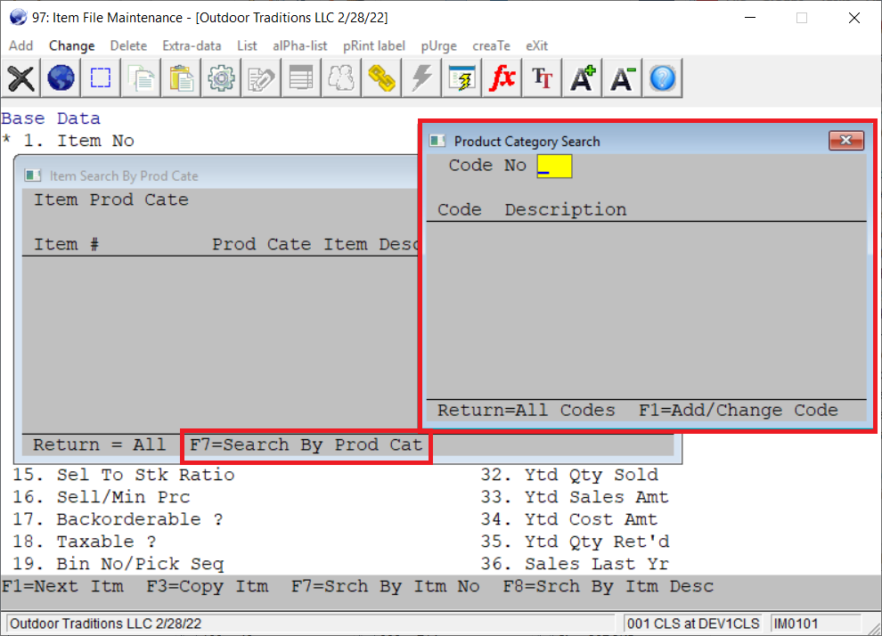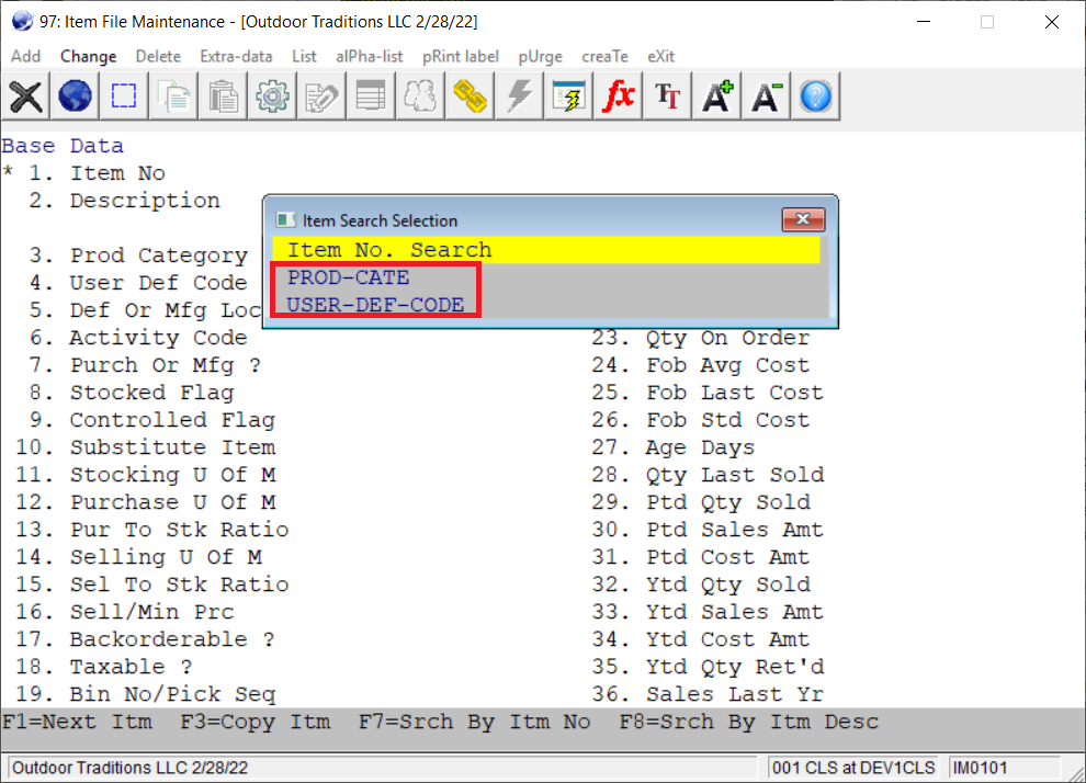 This feature adds the ability to search for the product category or the user-defined code while in the user-defined searches. For example, if the product category and user-defined code searches are enabled, pressing F7 to search for an item number will show the user the following options: Item No. Search, PROD-CATE, and USER-DEF-CODE.