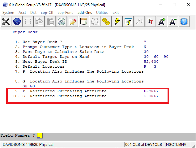 This feature allows the user to restrict purchases at a location when using the two-location version of Buyer's Desk. This is handled by associating a specific attribute with an item. This functionality is enabled through System Utilities-> Global Setup-> Add-On-> Buyer Desk-> fields 9 and 10.