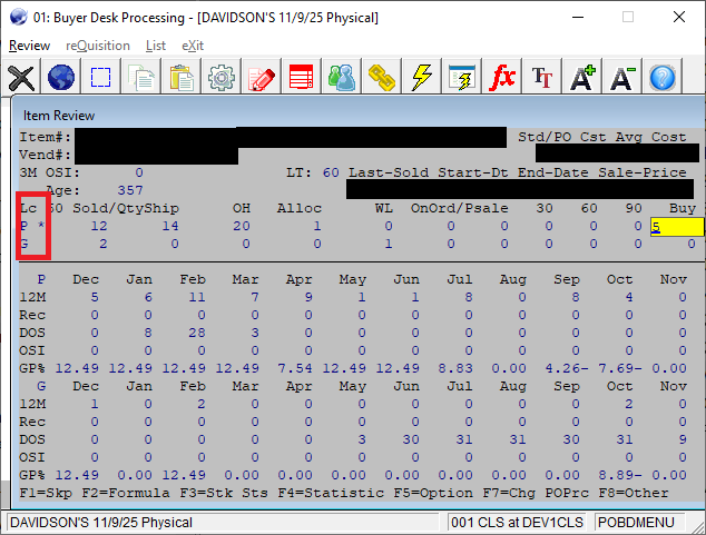 When in the Buyer's Desk Item Review screen and an item's purchase is restricted to a certain location, this location is marked with an asterisk.