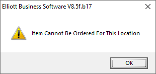 For example, in the screenshot above, the item may only be purchased at the P location. If the user tries to enter a quantity to buy at the G location, they will receive the message "Item Cannot Be Ordered For This Location":