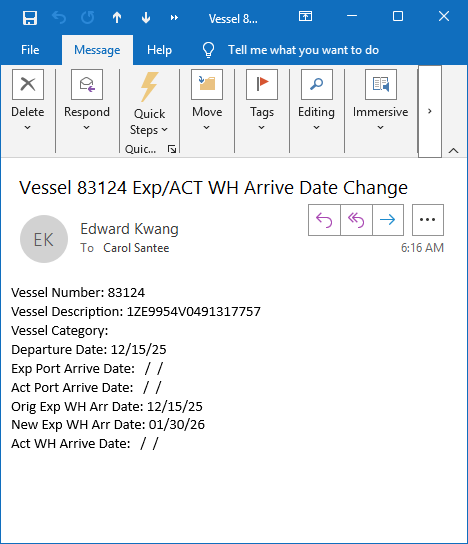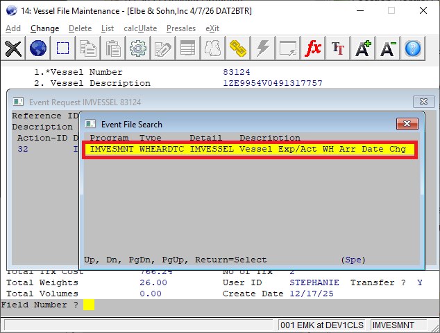 This event is triggered if the expected warehouse arrival date or the expected warehouse arrival date are changed in change mode of Vessel File Maintenance.
