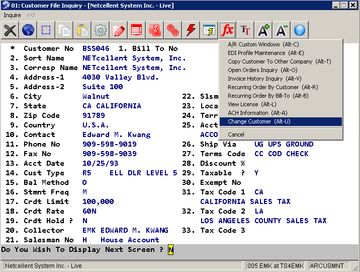 Using the Inquiry function especially makes sense in Elliott version 8.2 and later because we now allow most of the Inquiry functions to launch an equivalent "Change" through "Special Function." Below is an example showing how you can change customer information from the Customer Inquiry screen through "Special Function."