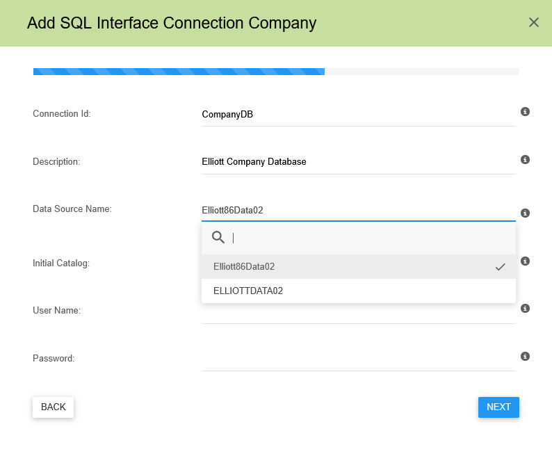 Now you can select the database that you made available on the connector computer. We will select our new database of Elliott86Data02.