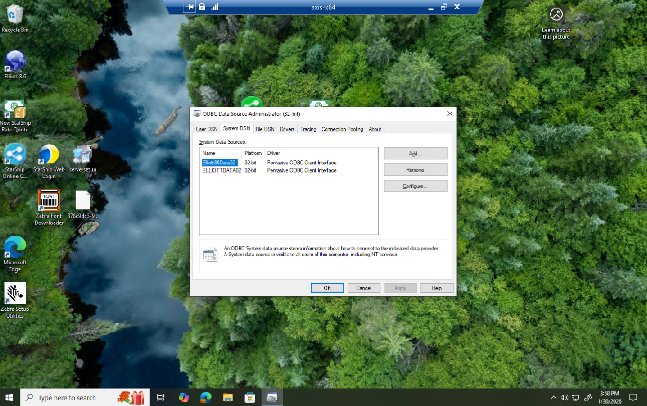 In this example, the computer name is axis-x64. Log into that computer and make sure the database you want to connect is available in the ODBC Administrator.