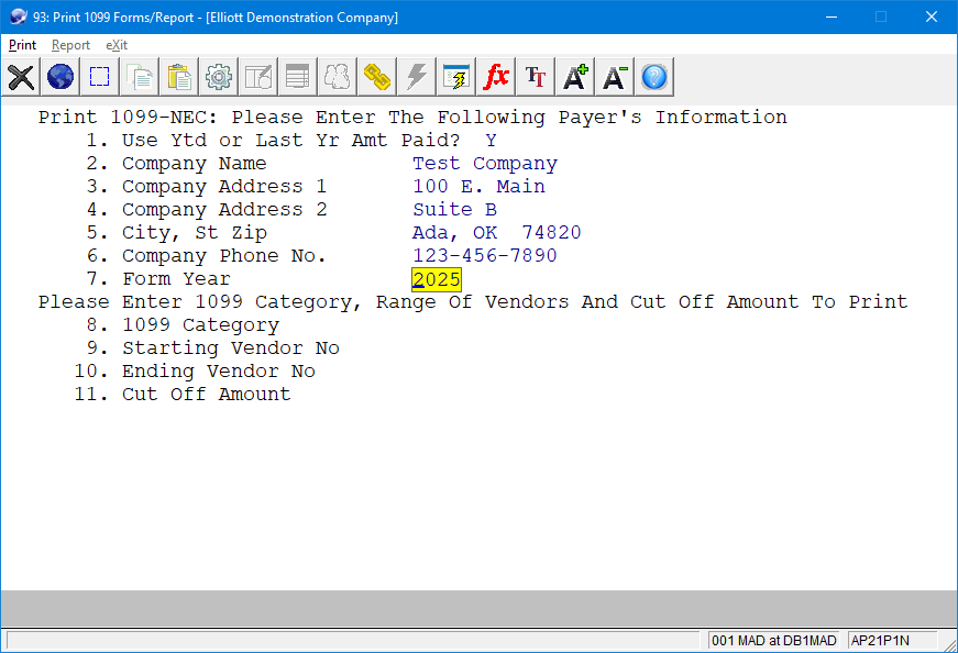 Release Date: 2/12/25 Version: 8.5 and Above This feature allows the user to enter the year that will be printed on the 1099-MISC and 1099-NEC forms. The form year has been added as an entry field when running Accounts Payable-> Processing-> ...