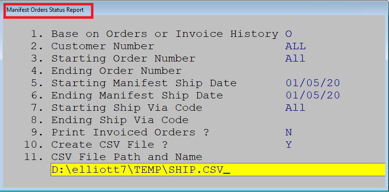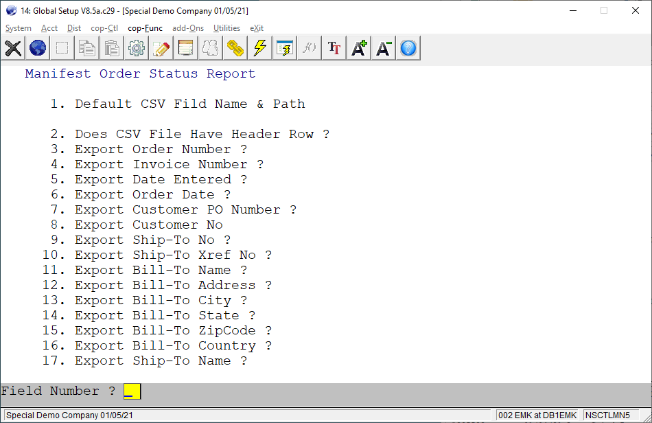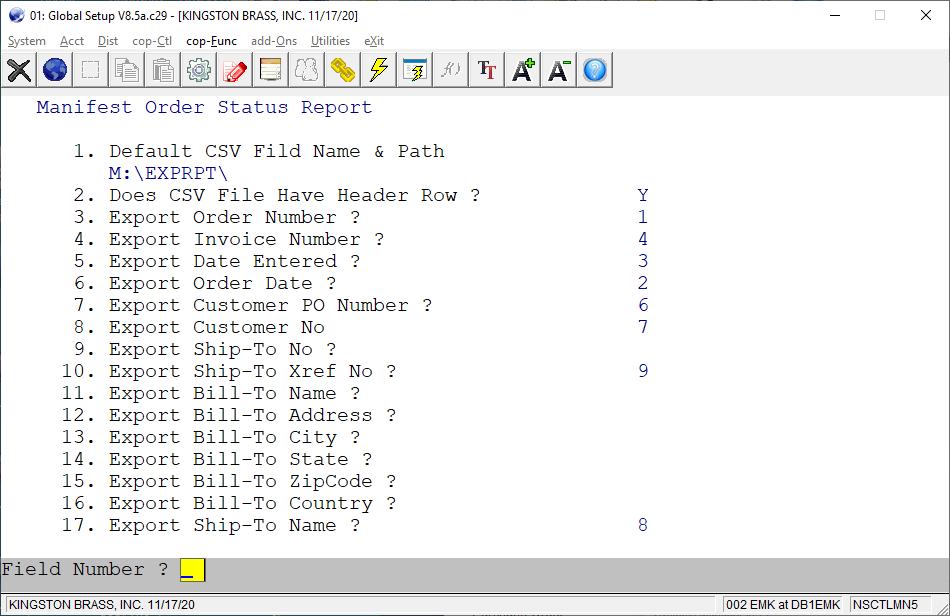 A - The reason for this happening is because the Manifest Order Status Report has to be set up before it is exported to CSV. Please go to Global Setup -> COP-Func -> Manifest Order Status Rpt. If it has not been set up, it will look like the following: