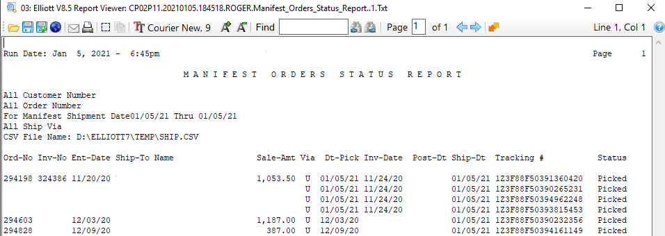 Q - I tried to run COP -> Processing -> Print Pikc/Pack Tickets -> Shipping -> Manifest Order Status Report. I tried to export the CSV file. The report comes up OK. But the CSV shows blank. See sample screen below: