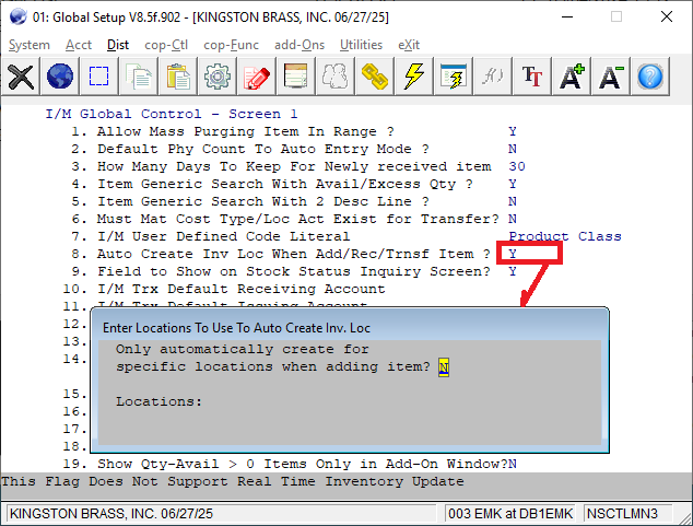 If this flag is set to "Y," then an item is added, we automatically create all inventory location controls for all locations. Some users would like to have more finite control and only want to do this for certain locations. Therefore, in November 2015, we added a popup window when the above flag is set to "Y" to prompt the user for the following: