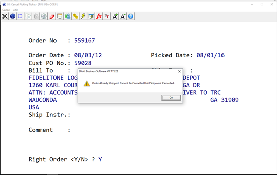 Q - I need to cancel the pick ticket for an order. The customer called to cancel the order while we are in the middle of shipping it. When we use the COP -> Util-Setup -> Cancel Pick Ticket, we are getting the following message: