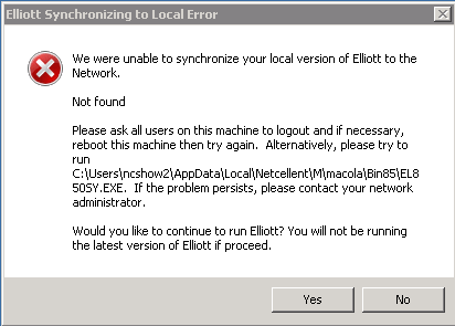 Other users with Elliott 8.5 that were already set up on this terminal server receive the following message when running Elliott from Local: