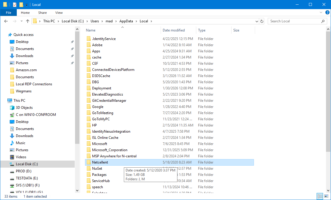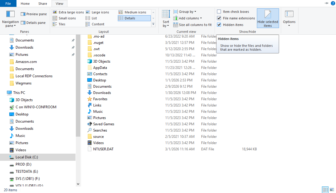 Next, browse to the folder where Elliott is installed on your local computer. For Elliott 8, this will be in C:\users\<username>\AppData\Local, where <username> is your Windows user name. The AppData folder might be hidden, so you need to click View at the top of the window and check the "Hidden items" checkbox.