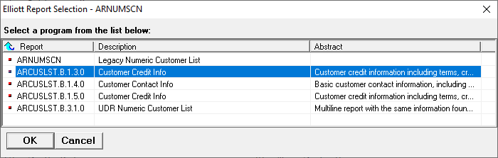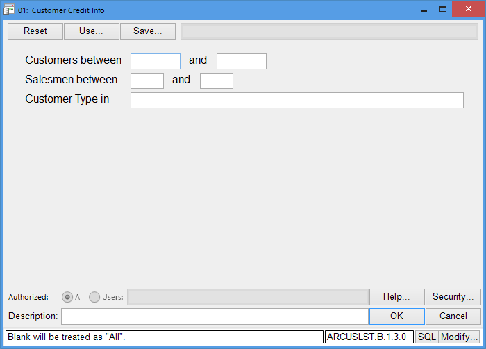Let's choose "ARCUSLST.B.1.3.0 Customer credit Info" from the list. The following sample screen should show up:
