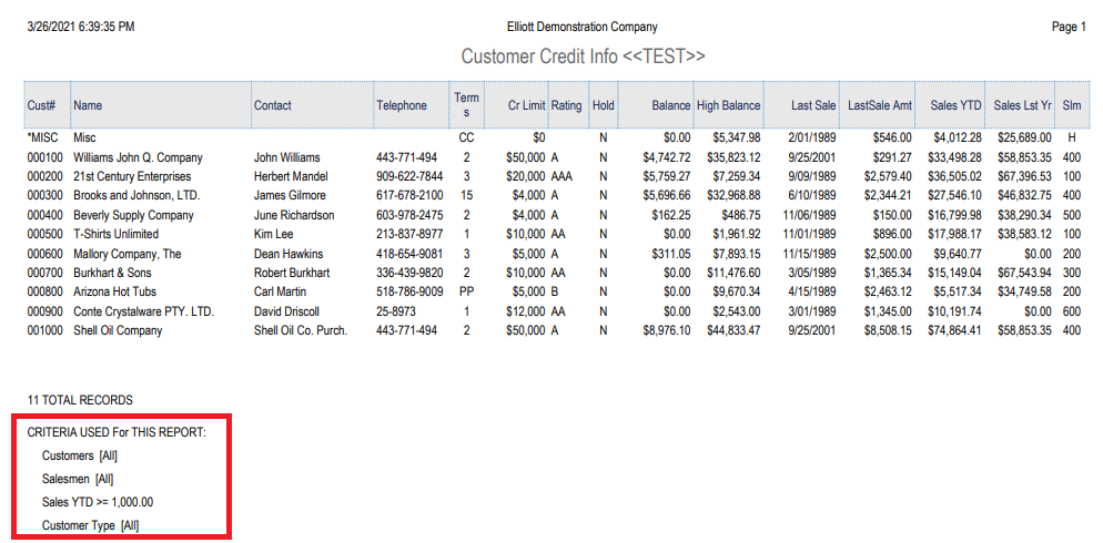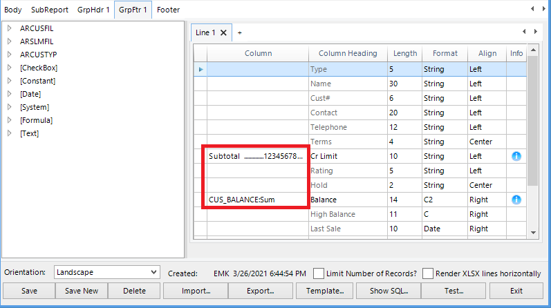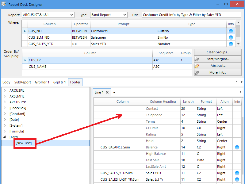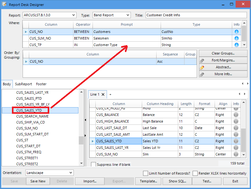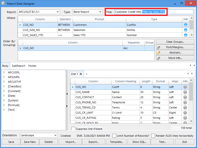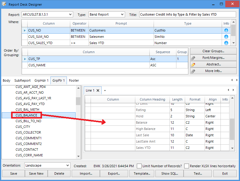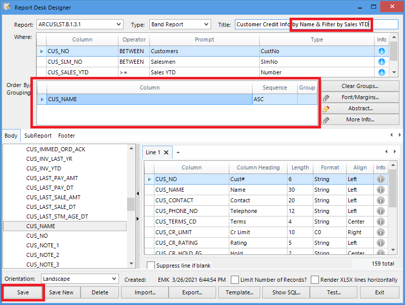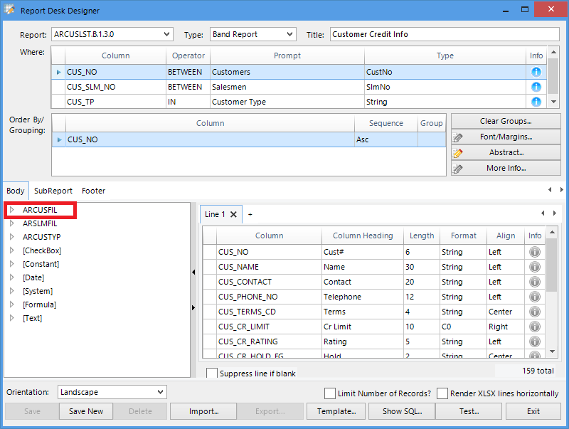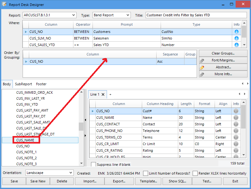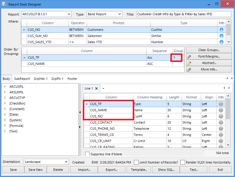 - Order By/Grouping - this determines how the data will be sorted. For example, you can choose to sort by CUS_NAME instead of CUS_NO.