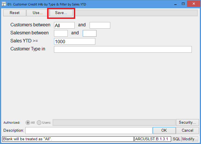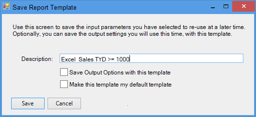 Let's say after you run this report many times, you notice you often choose the parameters of "Sales YTD >= 1,000". Also, you notice that you always export to Excel. To save yourself typing, you could save these parameters for future to reuse. To do so, after you enter the parameters, click on the "Save" tab.