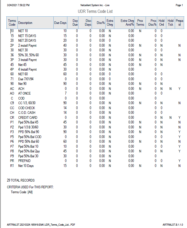 The "UDR Terms Code List" is the new Report Desk report. It has the format of ARTRMLST.X.1.2.3 where ARTRMLST is the type of report. The 1 stands for template ID; 2 stands for report ID; and 3 stands for the user's own revision. Each template can have multiple reports variances (i.e., a different report ID). Each report ID can have multiple revisions.
