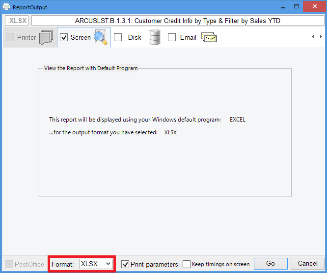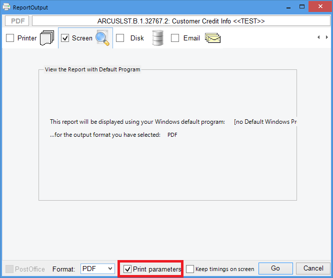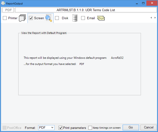 If you click "OK," the system will ask where you'd like the output to go. The default choice is "Screen" and "PDF" format. See sample screen below:
