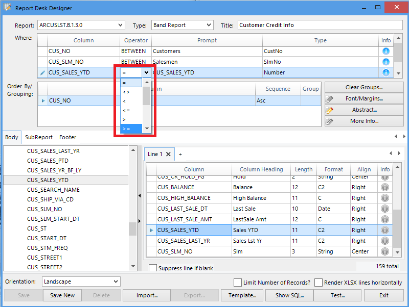 Now you can change the Operator of CUS_SALES_YTD in the Where area from default "=" (Equal) to ">=" (Greater Equal). See sample screen below: