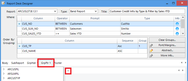 It is desirable to have a subtotal of Customer Balance, Sales YTD, Last Year. To do so, go to Report Desk design view. Click on the "GrpFtr 1" tab. "GrpFtr 1" stands for "Group Footer 1." Since you can have multiple levels of subtotals, you may have GrpFtr 2, 3...etc. On the right side, you will see a "+" plus sign. Click on that plus symbol to add "Group Footer 1" area. See sample screen below: