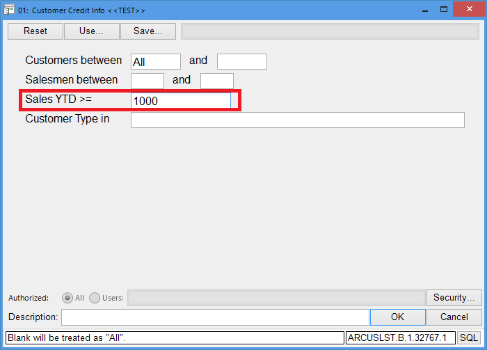 Let's say you would like to add a selection criteria based on customer sales year-to-date and only see those customers on this report when the year-to-date sales is greater than a certain amount. To accomplish this, you can click on the "Modify" button. The following sample screen will show up: