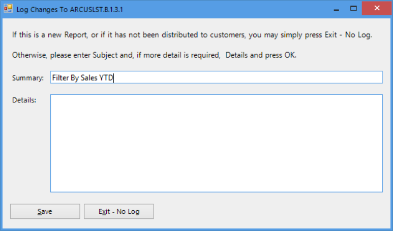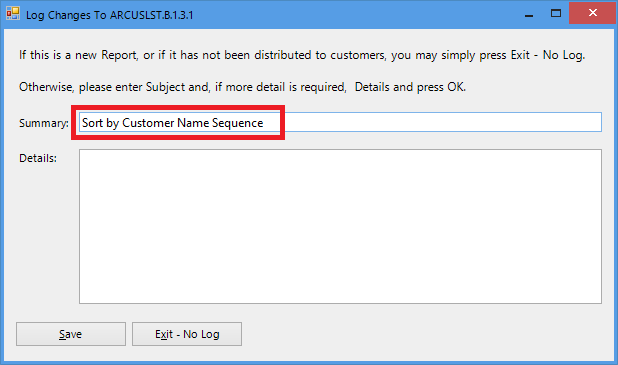 You will be prompted to log this change. You can either skip it by clicking on the "Exit" button, or put in something to indicate the nature of this change and click on "Save." See sample screen below: