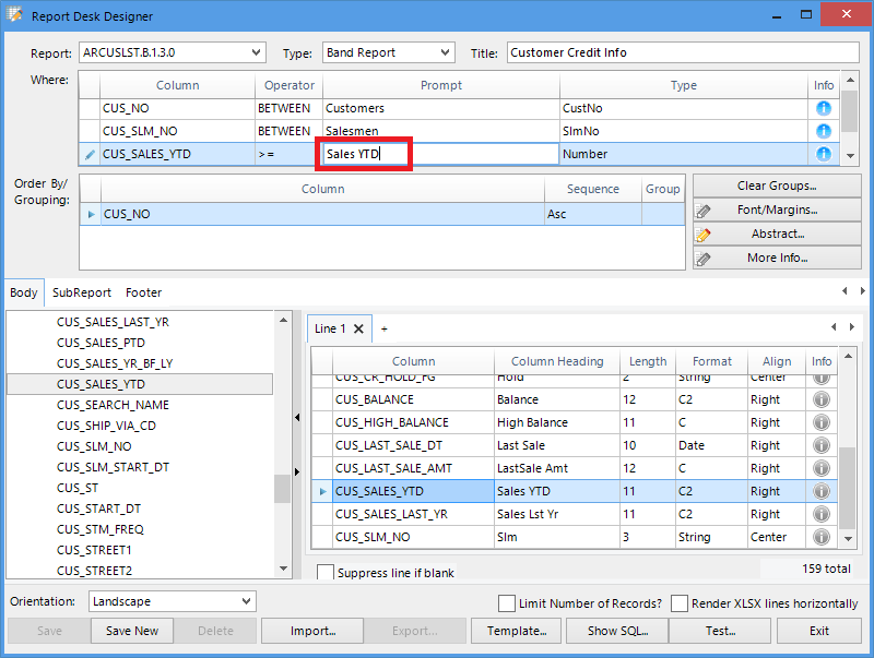 Now change the prompt from "CUS_SALES_YTD" to something more friendly like "Sales YTD." See sample screen below: