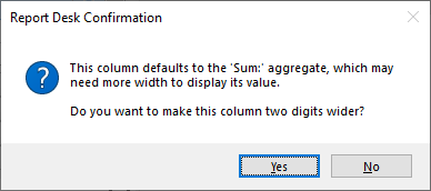 You will be prompted with the message "Do you want to make this column two digits wider?" because this is a subtotal area. Potentially, your total value may be bigger than the maximum column length reserved for the field. It is up to your discretion to answer "Yes" or "No" here. See sample screen below: