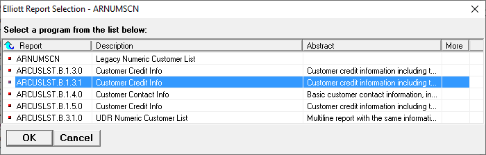 This screen will show the Legacy and the UDR (User Defined Report) options that are available for the report. The Legacy report is the original version of the Elliott report. The UDR reports are the new Report Desk reports. Each UDR report will have a unique ID with the following format: NAME.X.1.2.3 where: