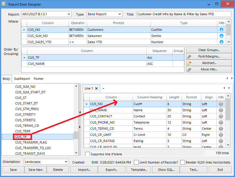 - Since CUS_TP is the first sorting column, it makes sense to make CUS_TP the first column. You can do so by dragging the CUS_TP and placing it just before the CUS_NO column in the "Line 1" area. See sample screen below: