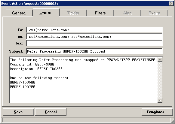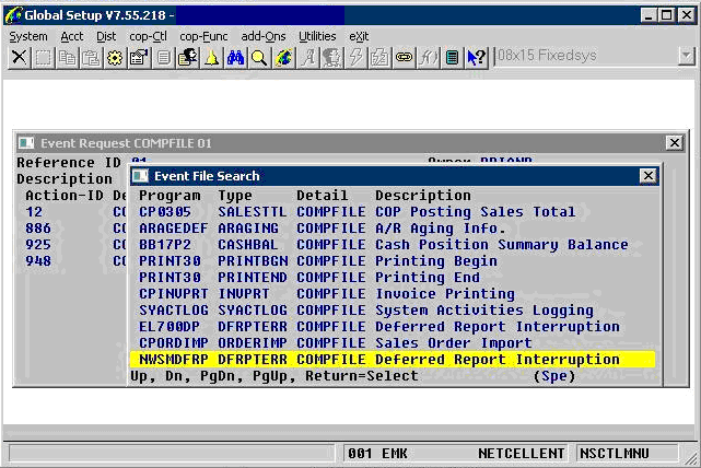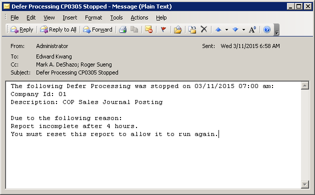 Q - I subscribe to an event so when there's a problem in deferred processing running overnight, I will receive an e-mail notification. For example, if a deferred processing posting routine is waiting for a record lock to release and it waits for more than 4 hours, I will receive an e-mail to notify me about that. See the sample screen below. But after I upgraded to Elliott V8, this event does not work anymore. Why?