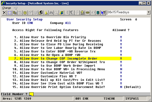 A - You can set the flag in Password Setup -> Global User Security -> Screen 6 -> “7. Allow User to Change COP Incomplete Order” to “Y.” See sample screen below: