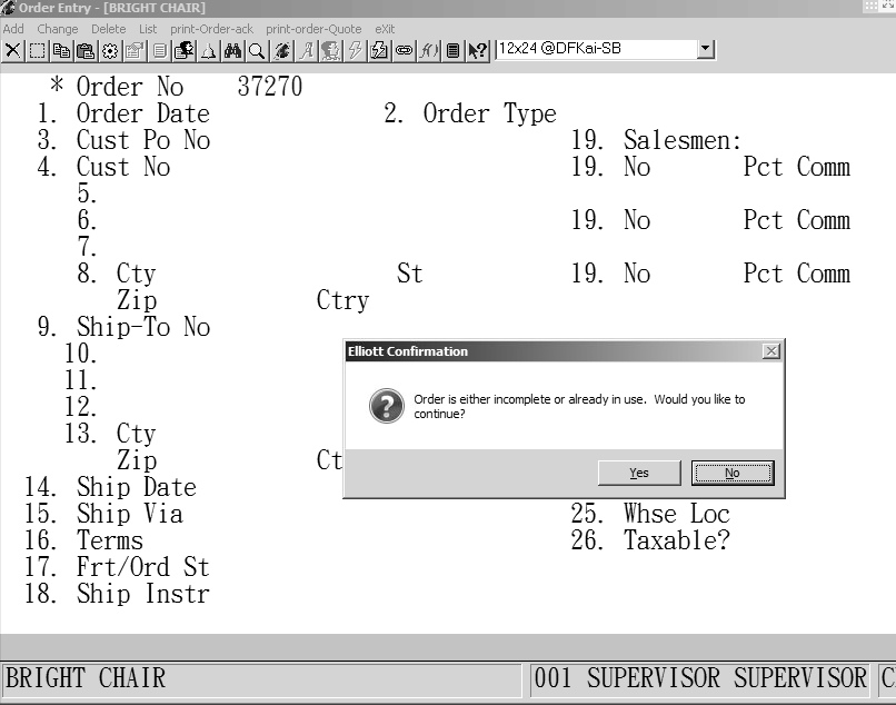 For example, we have seen the following scenario a few times: (1) User A brings up order# 1234 and goes to the order line item screen. This makes the order “incomplete”; (2) User B brings up the same order and receives the incomplete message; (3) Instead of making sure there’s no other user currently working on order# 1234, user B selects “Y” to make it complete and to gain access to the line item screen and make changes; (4) Then user B prints a pick ticket, invoices for order# 1234..etc. (5) Finally, User A exits order# 1234, and the order becomes “complete” instead of “invoiced.” You can imagine what a mess this can cause.